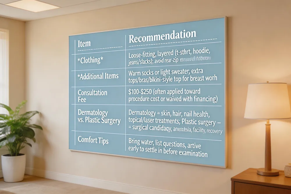 When you step into a plastic‑surgery office, the first practical step is what you wear and bring. Choose loose‑fitting, layered clothing—soft a‑shirt, hoodie, jeans or slacks—so you can easily uncover the area under discussion. Avoid tricky closures like rear‑zip dresses or tight buttons, and bring warm socks or a light sweater because exam rooms can feel chilly once shoes are removed. If you are considering breast work, pack a few extra tops, bras, or a bikini‑style top to help the surgeon illustrate how different implant sizes will look.