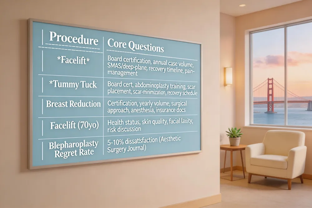 Questions to ask a plastic surgeon before a facelift – Verify board certification by the American Board of Plastic Surgery and years of dedicated facial‑rejuvenation training. Ask how many facelifts are performed annually, which techniques (SMAS, deep‑plane, etc.) are recommended for your anatomy, and whether the surgeon has hospital privileges and an accredited facility. Request before‑and‑after photos of patients with similar concerns, discuss the recovery timeline, pain‑management plan, and postoperative support. Finally, inquire about potential risks, the surgeon’s protocol for complications, and revision options.