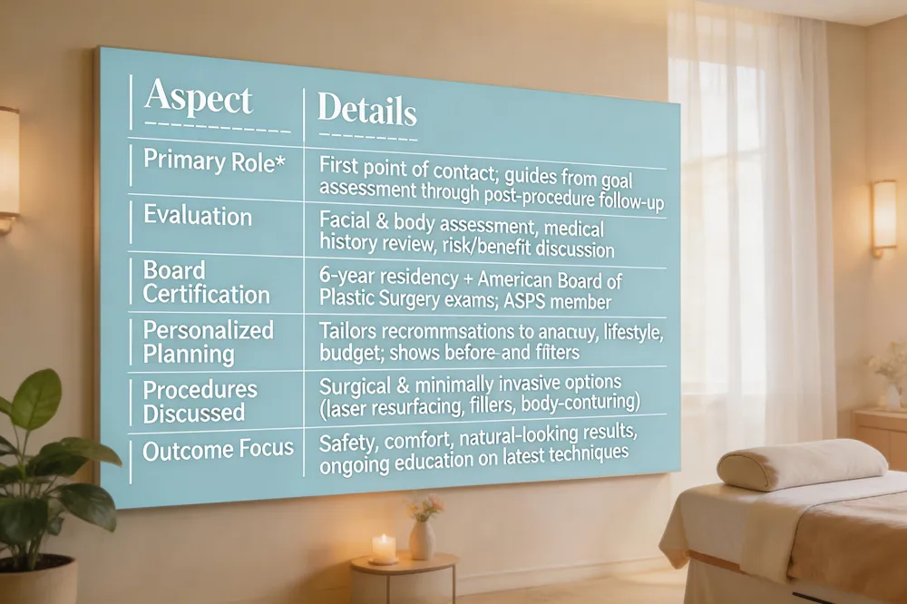 A plastic surgery consultant serves as the first point of contact in aesthetic care, guiding you from initial goals assessment through post‑procedure follow‑up. The consultant conducts a thorough facial and body evaluation, reviews your medical history, and explains the risks, benefits, and realistic outcomes of each option.