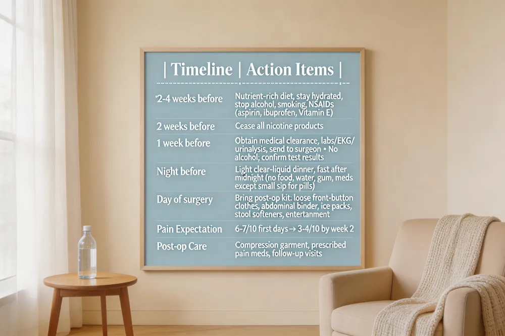 Preparing for a tummy tuck begins 2–4 weeks before surgery. Eat a nutrient‑rich, low‑processed‑food diet, stay well‑hydrated, and eliminate alcohol, smoking, and non‑steroidal anti‑inflammatory drugs (including aspirin, ibuprofen, and Vitamin E). Schedule a pre‑op visit with a board‑certified plastic surgeon to obtain medical clearance, review your health history, and complete any required labs, EKG, or urinalysis at least one week before the procedure. Two weeks prior, stop all nicotine products; one week before, refrain from alcohol and confirm that all test results have been sent to the surgical office. The night before surgery, have a light, clear‑liquid dinner and fast after midnight (no food, water, gum, or medication except a small sip of water with prescribed pills). Assemble a post‑op comfort kit—including loose front‑button clothing, a supportive abdominal binder, ice packs, stool softeners, and entertainment—to ensure a smooth recovery.