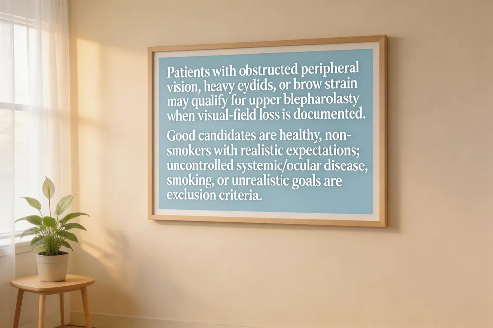 How to qualify for eyelid surgery? Candidates are healthy adults with stable medical conditions, non‑smokers, and realistic goals. A documented visual‑field loss or ptosis confirmed by an eye specialist, combined with a board‑certified oculplastic surgeon’s evaluation, establishes eligibility.