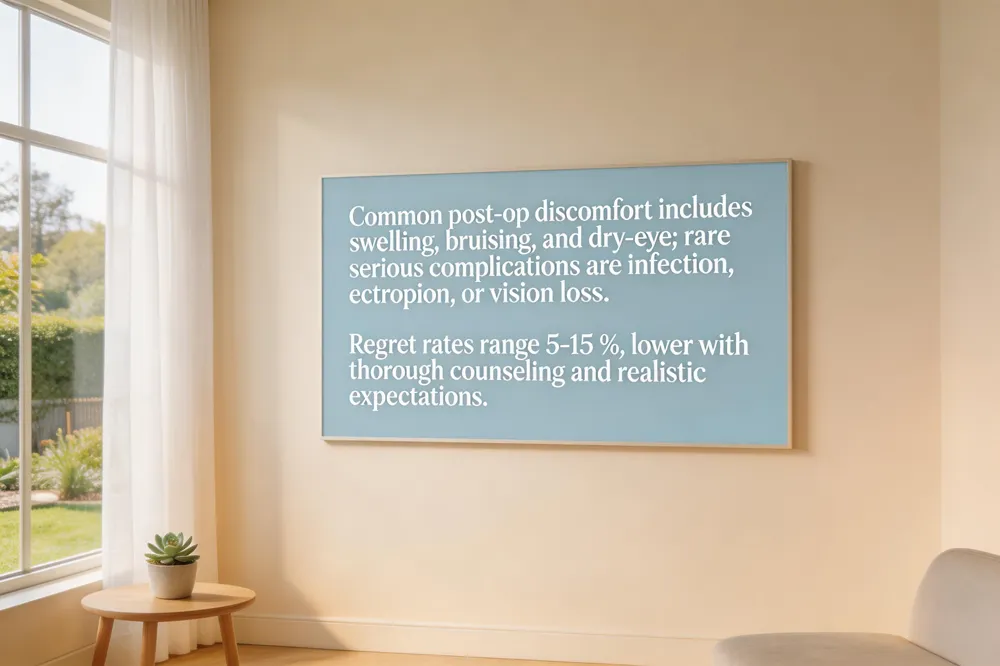 Regret and dissatisfaction rates – Clinical surveys report a regret or dissatisfaction rate of roughly 5 %–15 % for blepharoplasty. Lower rates are associated with thorough pre‑operative counseling and realistic expectations, while higher rates often stem from suboptimal surgical planning or unrealistic goals.