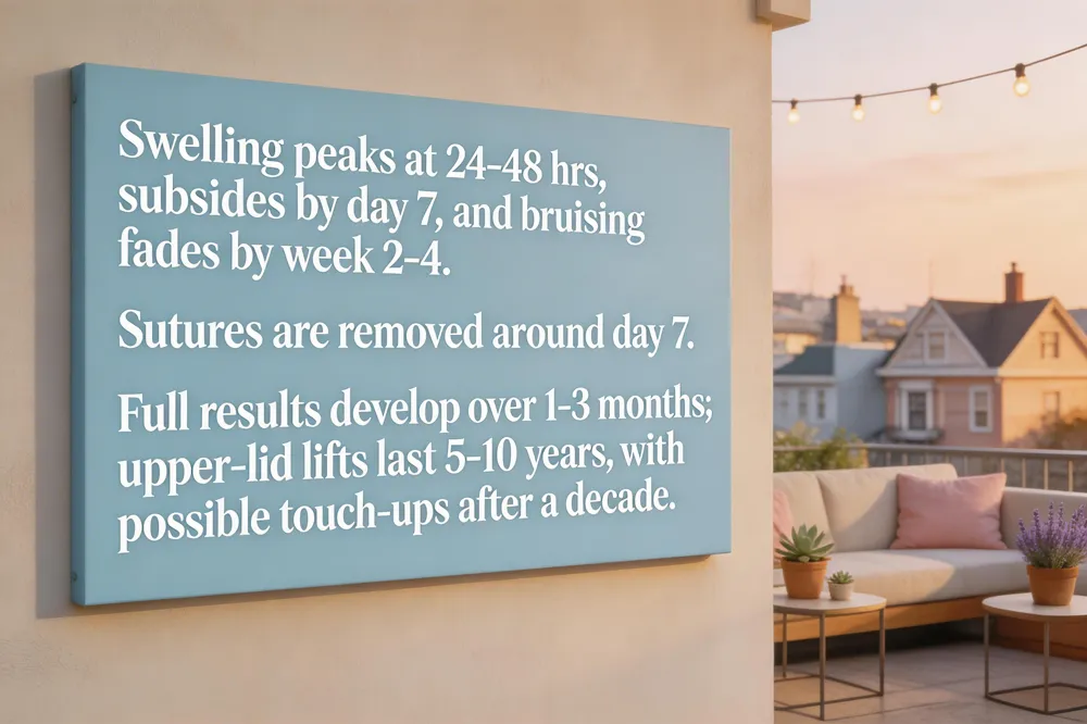 Day‑by‑day swelling and bruising patterns – In the first 24‑48 hours the lids are puffy, the incisions are red and bruises appear deep‑purple. By day 3‑5 the edema softens, bruising shifts to a muted purple, and the eyelid contour begins to look more natural. Around day 7 the surgeon removes most sutures; swelling is reduced 50‑70 % and bruises turn yellow. Weeks 2‑4 bring steady resolution of puffiness, even skin tone, and clearer eyes, though a faint “morning puff” may linger.