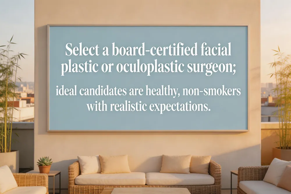 Eligibility criteria and contraindications: Ideal candidates are adults in good overall health, non‑smokers, with realistic expectations. Contraindications include uncontrolled diabetes, bleeding disorders, severe dry‑eye, active eye infection, or poor skin elasticity that would require a traditional surgical approach.