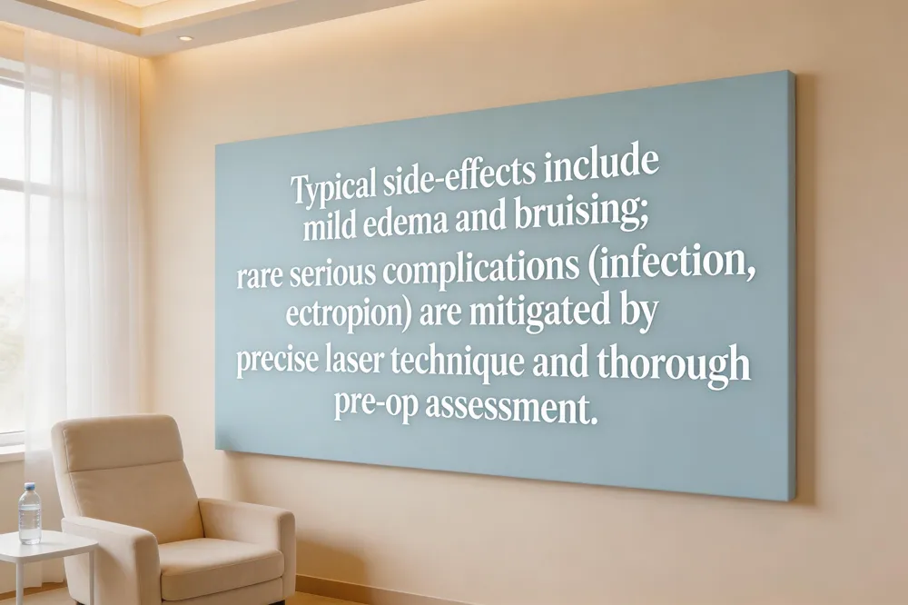 Safety is paramount: metallic ocular shields protect the cornea from stray laser energy, while procedures under local anesthesia with oral sedation minimizes systemic risk. The laser’s ability to coagulate vessels as it cuts reduces postoperative bruising and edema, leading to a typical 3‑4 day swelling period and return to work within a week.