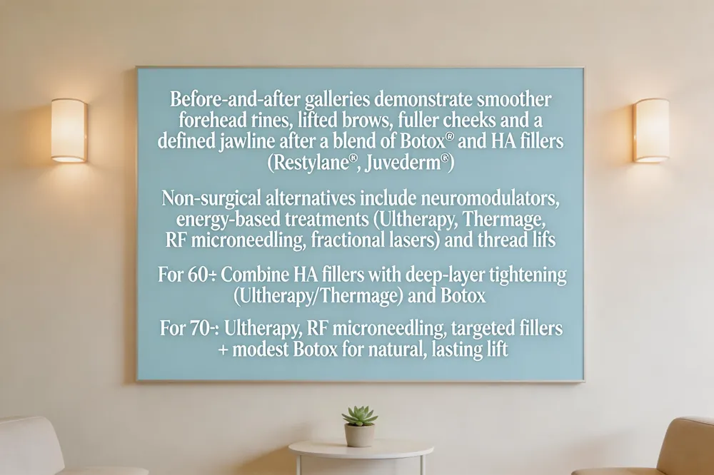 For patients over 60, the best approach pairs hyaluronic‑acid fillers with deep‑layer tightening technologies such as Ultherapy or Thermage, plus Botox for fine lines. At age 70, a customized protocol of Ultherapy, RF microneedling, targeted fillers and a small amount of Botox offers the most natural, lasting lift.