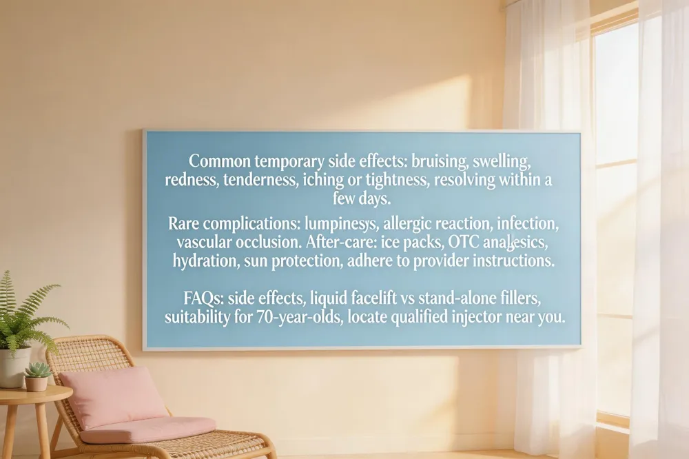 Common, temporary effects include bruising, swelling, redness, tenderness, itching, or a feeling of tightness at the injection sites, typically resolving within a few days. Less frequent issues are lumpiness, small nodules, allergic reactions, infection, or rare vascular occlusion. Management involves applying ice, using over‑the‑counter analgesics, following hydration and sun‑avoidance guidelines, and adhering to the provider’s after‑care instructions. Serious complications are uncommon when performed by an experienced, board‑certified injector.