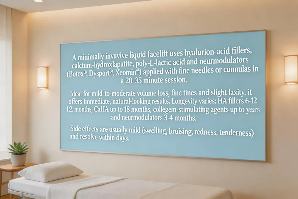 A liquid facelift is a non‑surgical facial rejuvenation that uses injectable dermal fillers and neuromodulators to restore volume, smooth lines, and subtly lift sagging tissue. Key components include hyaluronic‑acid fillers (e.g., Juvederm, Restylane), collagen‑stimulating agents such as poly‑L‑lactic acid (Sculptra) or calcium hydroxylapatite (Radiesse), and neurotoxins like Botox to relax dynamic wrinkles. The office‑based procedure typically lasts 15‑45 minutes, beginning with a topical anesthetic followed by precise injections; most patients resume normal activities immediately. Ideal candidates are individuals with mild‑to‑moderate skin laxity, fine lines, and modest volume loss who seek quick, reversible results without incisions.