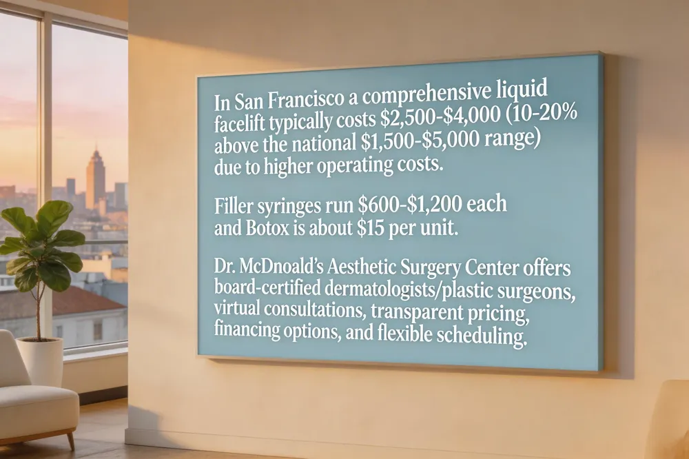 For patients in the Bay Area, the Aesthetic Surgery Center in San Francisco offers board‑certified facial plastic surgeons who perform liquid facelifts using Botox®, Juvederm®, Radiesse®, and Sculptra®. The office is completed in under an hour with minimal downtime. To schedule a confidential consultation, call (415) 555‑1234 or book online.