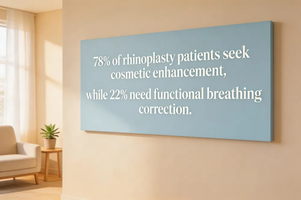 Rhinoplasty’s main reasons: 78% seek cosmetic enhancement, while 22% need functional breathing correction; surgeons balance aesthetic goals with airway improvement for optimal outcomes in patients.