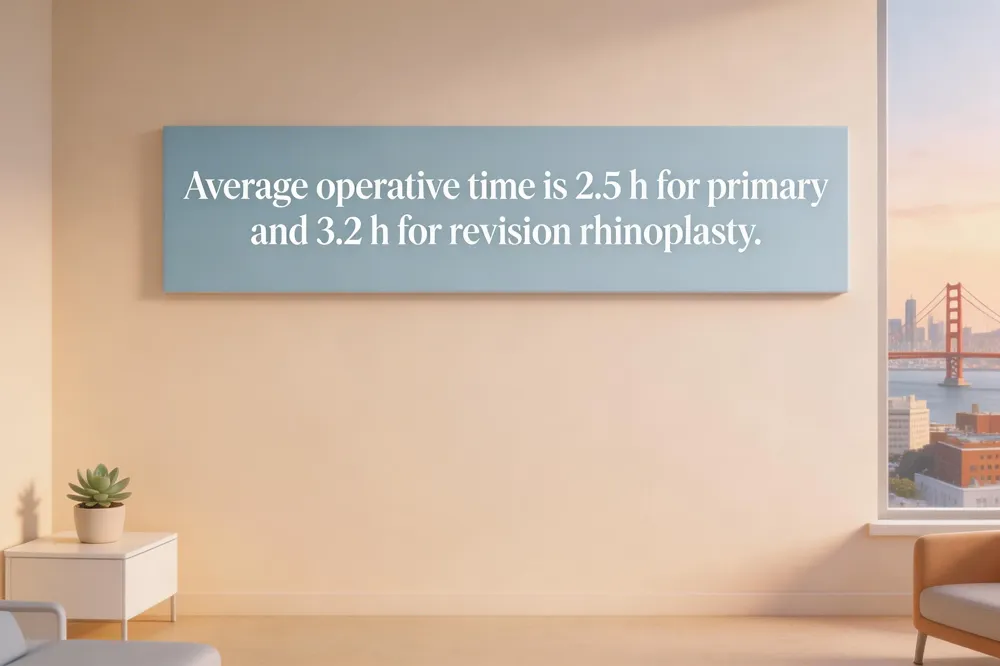Primary rhinoplasty typically lasts 2.5 hours, while revisions average 3.2 hours due to scar tissue, grafting, and complexity, reflecting longer surgical duration and increased planning.