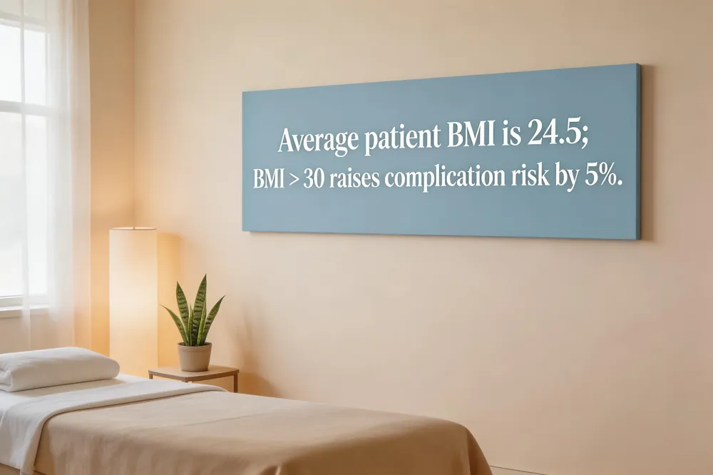 The typical rhinoplasty patient has a BMI of 24.5. When BMI exceeds 30, complication risk rises about five percent, underscoring importance of weight management pre‑surgery.