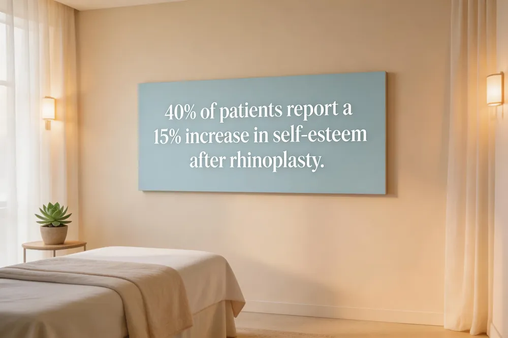 Forty percent of rhinoplasty patients report a fifteen‑percent boost in self‑esteem, measured by FACE‑Q/ROE scores after surgery and reflecting heightened confidence and psychological well‑being.