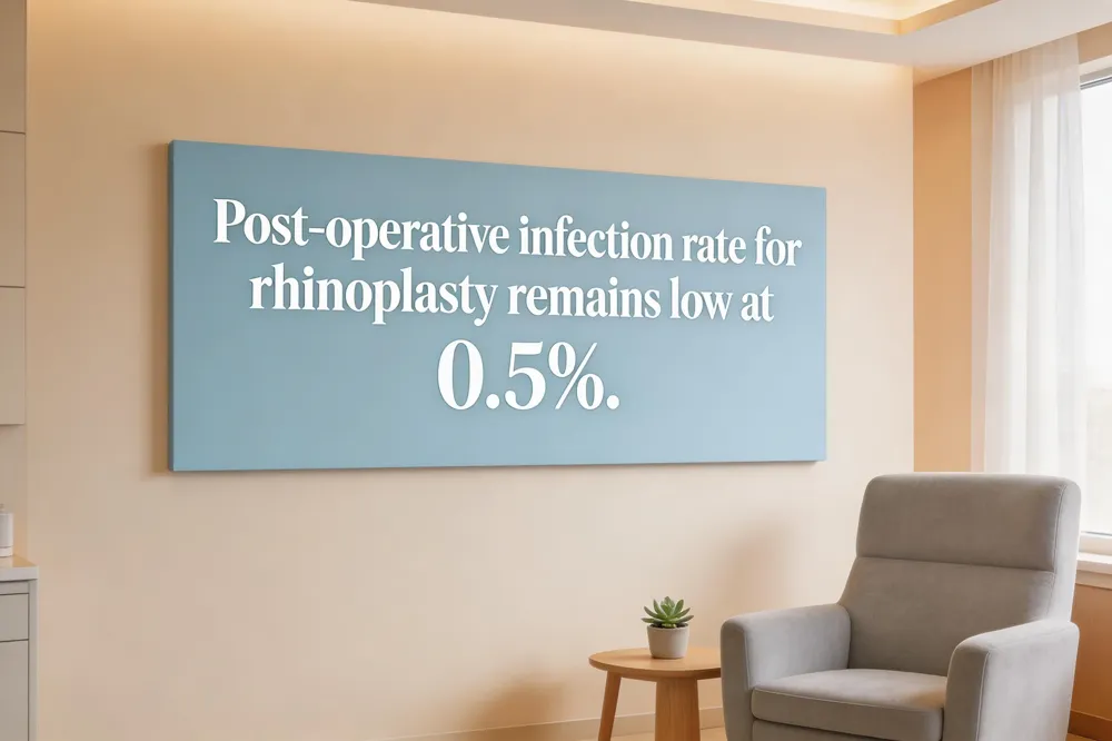 Rhinoplasty infection remains rare, with a 0.5% overall complication rate. Low infection rates reflect sterile techniques, accredited facilities, and postoperative compliance and efficient healing overall.