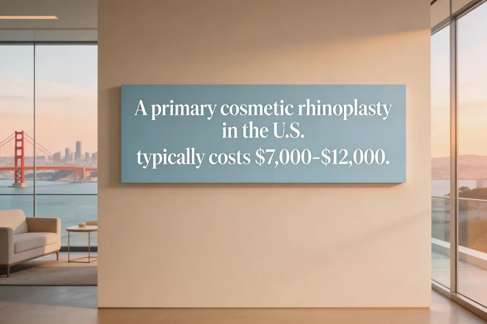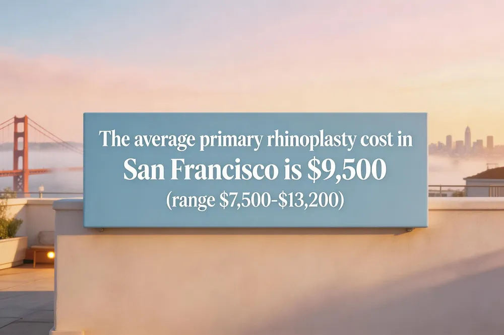 San Francisco primary rhinoplasty averages $9,500, with a $7,500‑$13,200 range, higher than the U.S. average $7,000‑$12,000; elite surgeons may charge $14,000‑$30,000 for advanced techniques and procedures.