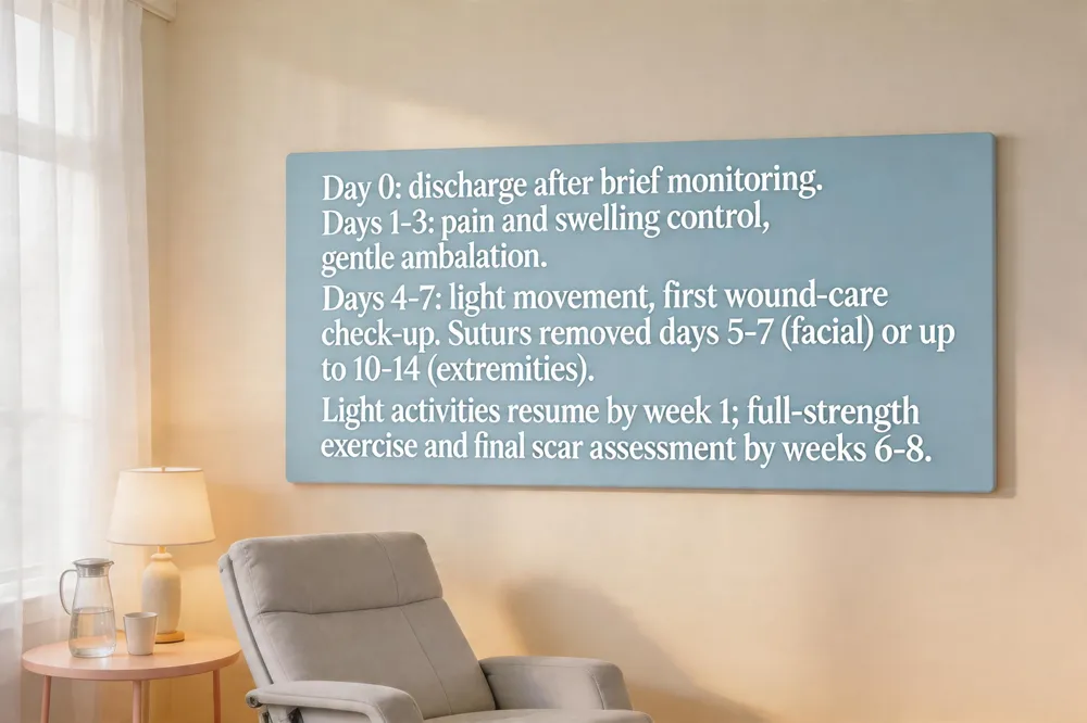 Answer to the key question – The typical recovery milestones for plastic‑surgery patients include discharge on Day 0, intensive pain and swelling management during the first three days, suture removal around Day 5‑7 (or up to 10‑14 days for certain sites), a steady return to light activities by the end of the first week, and progressive escalation to normal exercise and final scar evaluation by six to eight weeks post‑procedure.