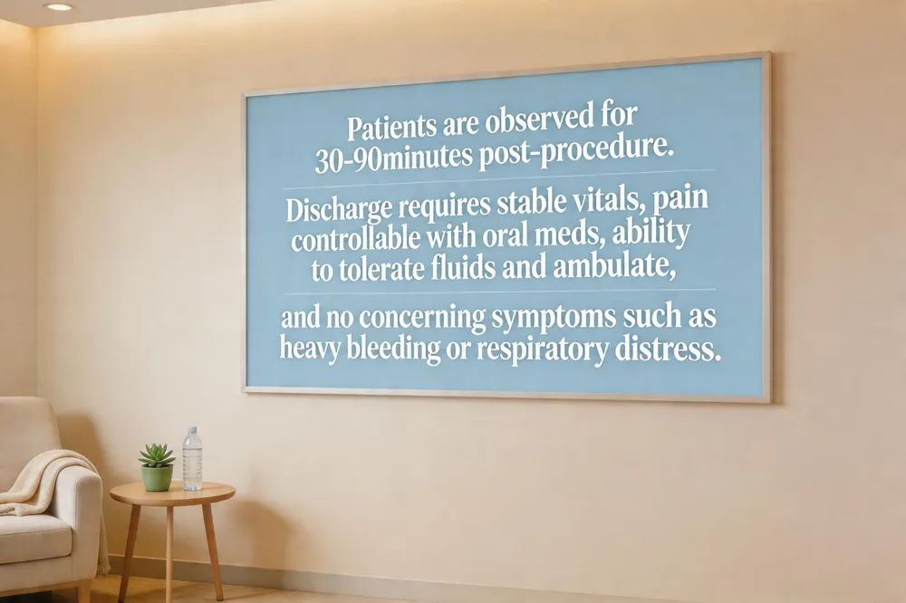 Patients are typically monitored in the recovery room for about 30 to 90 minutes after a facial or body cosmetic procedure. The exact duration depends on anesthesia type, procedure extent, and how quickly vital signs stabilize. For minimally invasive facial work performed under local anesthesia, the stay is often closer to 30 minutes; more extensive body lifts or surgeries requiring deeper sedation may extend to an hour or slightly longer. During this period nurses assess pain, nausea, blood pressure, pulse, and oxygen saturation, ensuring the patient can tolerate oral fluids and ambulation. Discharge criteria include stable vital signs, controlled pain with oral medication, absence of concerning symptoms (e.g., excessive bleeding or respiratory distress), and the patient’s ability to understand post‑operative instructions. Once these benchmarks are met, the patient is cleared to transition to home recovery.