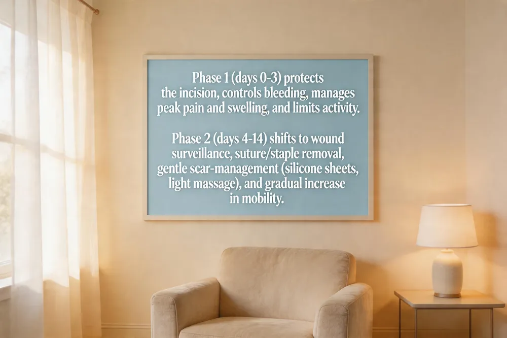 Day‑by‑day healing priorities – Phase 1 (days 0‑3) focuses on protecting the surgical site, controlling bleeding, and establishing a clean wound environment. Dressings remain intact for the first 48 hours, compression garments are worn continuously, and head‑elevation reduces facial edema. Phase 2 (days 4‑14) shifts to monitoring wound integrity, removing sutures or staples as scheduled, and beginning gentle scar‑management techniques such as silicone sheets or light massage after two weeks.