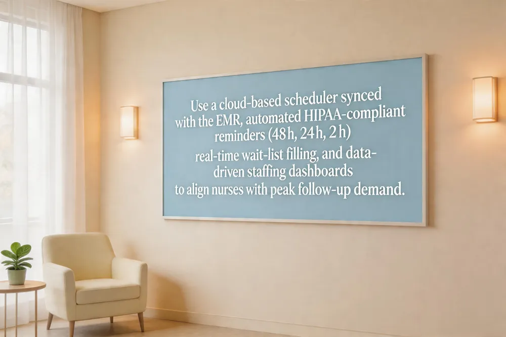 Automated reminders and wait‑list management – Use HIPAA‑compliant messaging (SMS, email, patient portal) to send personalized reminders 48 hours, 24 hours, and 2 hours before each appointment, reinforcing wound‑care instructions and pain‑medication schedules. An automated wait‑list engine fills last‑minute cancellations by notifying eligible patients in real time, cutting no‑show rates by up to 30 %.