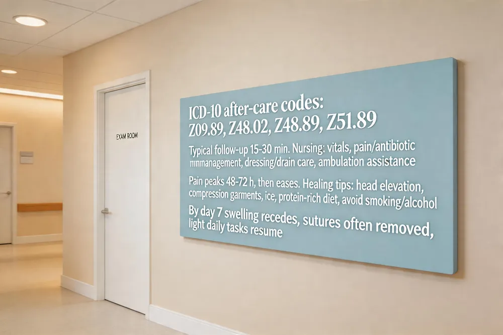 Knowing what ICD‑10‑ are used for post‑surgery follow‑up visits? Follow‑up encounters are usually coded with Z‑category after‑care codes such as Z09.89 (follow‑up after other procedures), Z48.02 (suture removal), Z48.89 (general after‑care), and Z51.89 (other after‑care). Selecting the correct code ensures proper reimbursement and documentation.